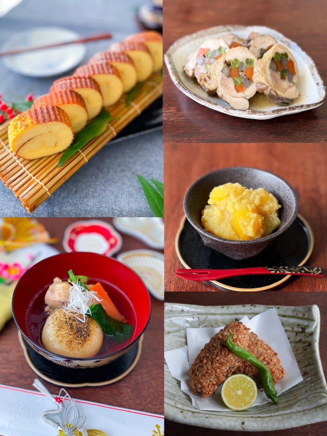 出汁香るお雑煮から、栗きんとん・伊達巻といった定番おせち、さらに鶏の八幡まきやさわらのナッツ揚げまで、家庭で作れるお祝い膳をバランスよく学びます。