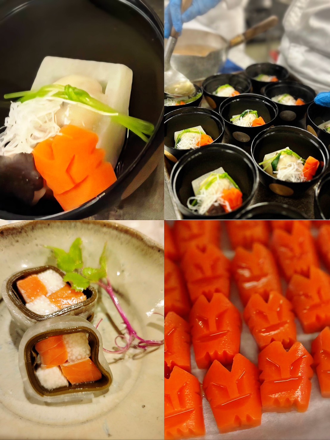 1.蟹と長芋市松奉書巻き 土佐酢 生姜 防風