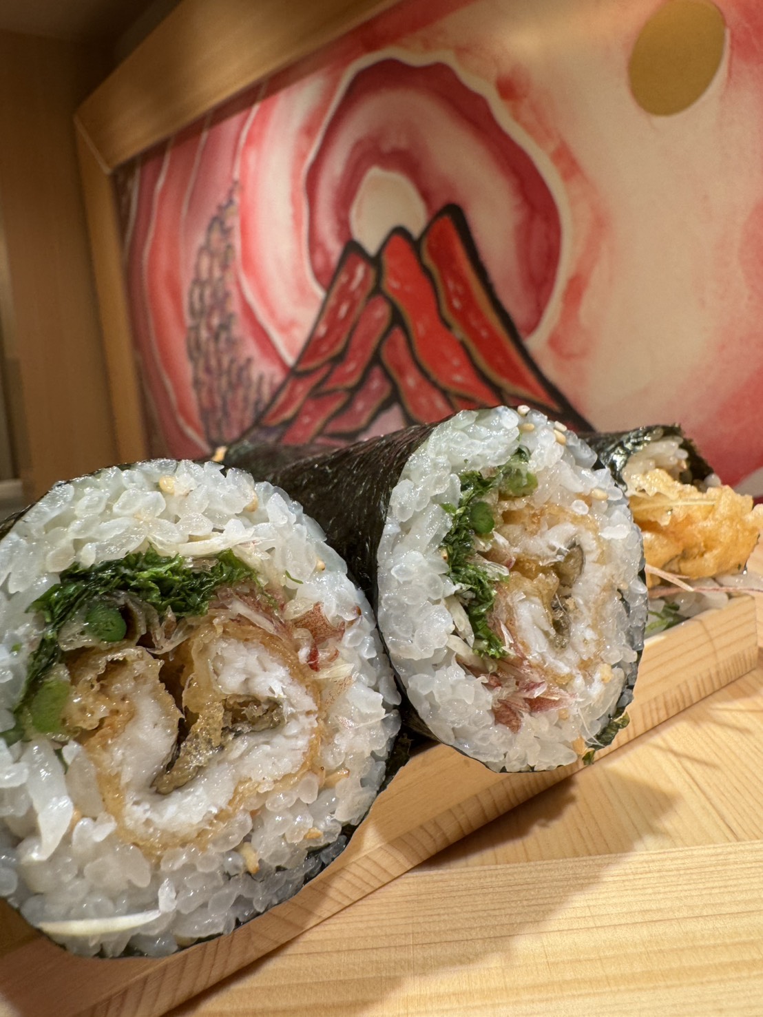 うまみたっぷりの穴子を天ぷらにし、みょうがや春野菜と合わせた、清涼感のある春らしい巻き寿司に挑戦。